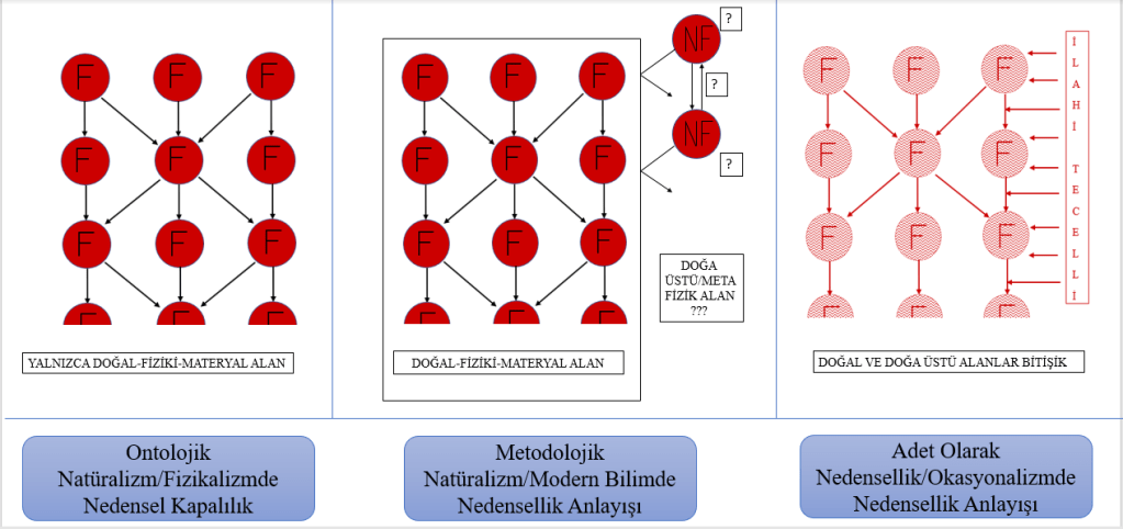 F: Fiziksel Neden, NF: Fizik Üstü Neden. Günümüze kadar bilimin felsefi metodolojisi olarak kabul edilegelen metodolojik natüralizmin nedenselliğe yaklaşımı, fizikalizmle hemen hemen aynıdır ve nedensel kapalılığı, doğal olayların yalnızca doğal nedenlerle açıklanabileceğini kabul etmektedir.[4]
