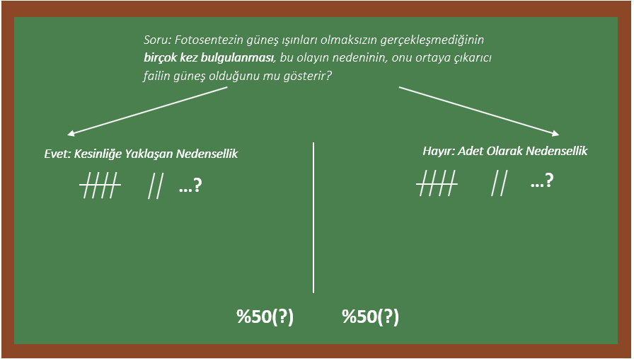 Gerçekten de eğer, söz konusu ardışıklığın tespit edildiği her durumu onların hesabına pozitif bir sayı olarak ekleyebiliyorsak nihayette varacağımız sonuç, güneş ışığının fotosentezin nedeni olduğudur. İşte tam bu noktada, bizim “adet olarak nedensellik” ismini verdiğimiz görüş devreye girer ve şunu ileri sürer “Artı olarak sandığınız A’nın B tarafından izlendiği olayların her biri bizzat doğa üstü bir İrade’nin ikisini sürekli ardışık(mukarin) biçimde meydana getirmesinden de kaynaklanıyor olabilir. Dolayısıyla kesinliğe yaklaşmayı bırakın %50 olasılığa dahi varamazsınız”