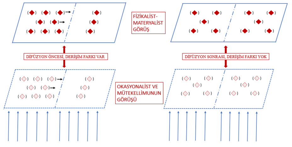 Oysaki eğer maddeler her an varlık sahnesinde tutulmaya muhtaç şeylerse, bu takdirde difüze olmadan önceki hallerinden difüze olduktan sonraki hallerine geçmeleri için fiziki etkileşimlerle düzenlenmeleri zorunluluğu ortadan kalkar. Basit biçimde, üst üste çekilen iki fotoğrafta nasıl elektronlar farklı farklı görsel kalıplara dökülüyor ve böylece birbirinden ayrı görüntüler meydana gelebiliyorsa öyle de moleküllerin de birbirinden farklı ilim kalıplarına göre her an için birbirinden bağımsız olarak var edildiklerini[14] ve böylece bizim gözlemleyebildiğimiz farklı düzen koşullarının (difüzyon öncesi ve difüzyon sonrası) meydana gelebildiğini düşünebiliriz.