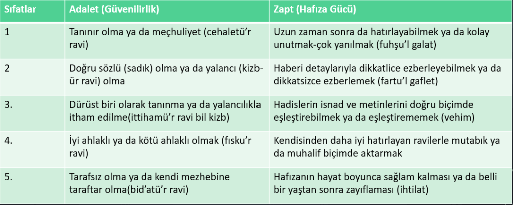 Ve yine habercinin hafıza gücüyle ilgili yukarıda saydığımız 5 husus da ravilerin ehliyeti yani haberi tam ve hatasız biçimde nakledilmesi konusunda incelenmiş, Cerh ve Ta’dil ilmi için ikinci esas şart olmuştur. (ki “zabt” terimiyle de anılmaktadır; yıllar sonra dahi hatırlayabilmek ya da çok çabuk unutmak-çok yanılmak, sözü-olayı kelimesi kelimesine ve detaylarıyla dikkatlice hafızasına kaydedebilmek ya da detaylara dikkat etmeden dikkatsizce ezberlemek, hadislerin isnat ve metinlerini doğru biçimde eşleştirebilmek ya da hadislerin isnatlarını veya metinlerini birbirine karıştırmak-vehim, kendisinden daha iyi hatırlayan ravilerle aynı ya da farklı şekilde aktarmak, hafızası hayatı boyunca sağlam olmak ya da yaşı ilerledikten sonra hafıza kaybı yaşadığından dolayı haberi doğru iletememek). Öyle anlaşılmaktadır ki ravilerin hatırlama kabiliyetleri, yalnızca hayatlarının bir kesitlerinde değil bütünü boyunca izlenmiş, kaydedilmiş; hadisi hafızası zayıfladığı vakitten sonra (ihtilat) aktardığı hadisler kabul edilmemiştir.