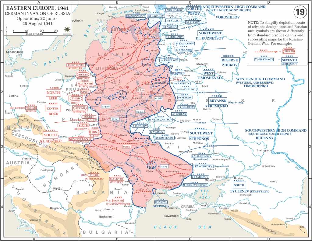 22 Haziran 1941’de Alman saldırısı, 1940’ta Fransa’nın işgalinde olduğu gibi aynı komutanlar altındaki üç ordu grubu tarafından başlatıldı. Solda (kuzeyde), General Wilhelm von Leeb komutasındaki bir ordu grubu, Doğu Prusya’dan Leningrad (şimdi St. Petersburg) istikametinde Baltık Devletleri’ne saldırdı. Sağda (güneyde), Gen. Gerd von Rundstedt komutası altında, General Paul Ludwig von Kleist komutasındaki zırhlı ordu grubu, güney Polonya’dan Ukrayna’ya, Kiev’e doğru ilerledi. Hedef, buradan güneydoğu kıyılarına doğru Karadeniz ve Azak Denizi’ne ilerlemekti. Son olarak, merkezde, Pripet Bataklıklarının kuzeyinde, ana darbe General Fedor von Bock’un komutası altında General Heinz Guderian ve General Hermann Hoth’un zırhlı birlikleri ile yapıldı; Birlikler SSCB kuvvetlerini Smolensk ve Moskova istikametinde kuzeydoğuya doğru ittiriyorlardı.