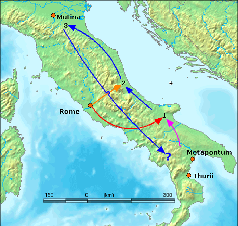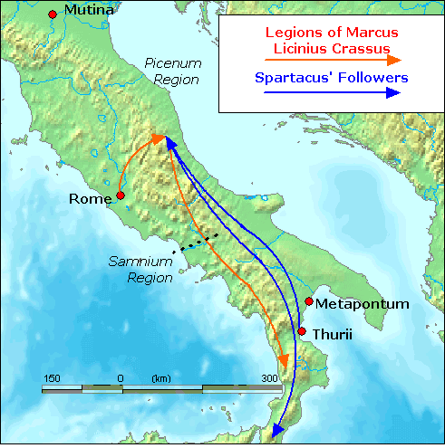 Apulia’daki Garganus Dağı’nda Crixus komutasındaki bir grup Alman köleden oluşan kuvvet, Praetor Quintus Arrius tarafından sert bir şekilde yenilgiye uğratıldı ancak Romalıların bu galibiyeti, isyanı kontrol etmeye fazla bir katkı sağlamadı. Plutarkhos’a göre, Spartacus, isyancı ordusunun ana kuvvetleriyle birlikte Consul Lentulus’u yendi ve ardından Alplere doğru yöneldi. Gallia Cisalpina valisi Gaius Cassius ve Praetor Gnaeus Manlius komutasındaki 10.000 kişilik bir kuvvet Mutina’da yenilgiye uğratıldı. Artık umut ettikleri özgürlük ufukta görünüyordu ve Plutarkhos, Spartacus’ü, isyancı ordusunun tamamen mobilize edilmiş bir Roma ordusunu yenme şansı hakkında değerli fikirlere sahip biri olarak nitelendiriyordu. Spartacus, Alpleri geçip eve dönmek yerine Roma’ya doğru yürüdü. Başkente saldırmak yerine tekrar Lucania’ya geçti.