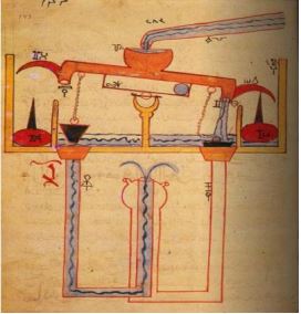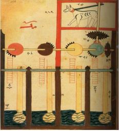 Bilgisi Hakkında Kitap” adlı eserinde betimlediği tasarımlarından; soldaki fışkırtmalı fıskıye, sağdaki suyu yukarıya çıkarma sistemi.