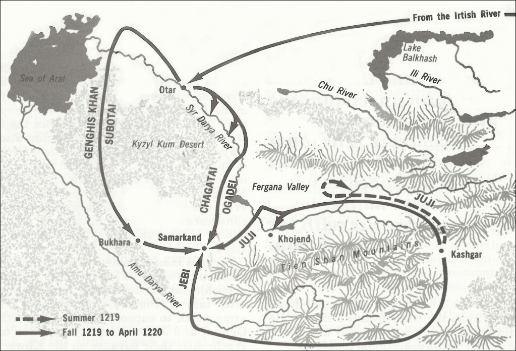 1219 Sonbaharında Ögeday’ın ve Çağatay’ın Otrar’a saldırdığı sırada Cengiz ve Subutay kuzeye dönerek bir anda kayboldu. Güneyde Juji ve Jebe kuvvetlerini ikiye böldü. Jebe 20.000 askeri ile birlikte herhangi bir rezerv kuvvetin imhası ve Transoksanya’ya güneyden ilerlemek üzere Amu Derya’nın güneyinden Horasan içlerine ilerledi. Juji batıya ilerledi. Juji’ye verilen görev 400 millik bir hatta Ögeday ve Çağatayla birlikte hareket ederek bölgedeki büyük tahkimatların imha edilmesi ve zincir boyunca bütün bölgenin işgal altında tutulmasıydı.